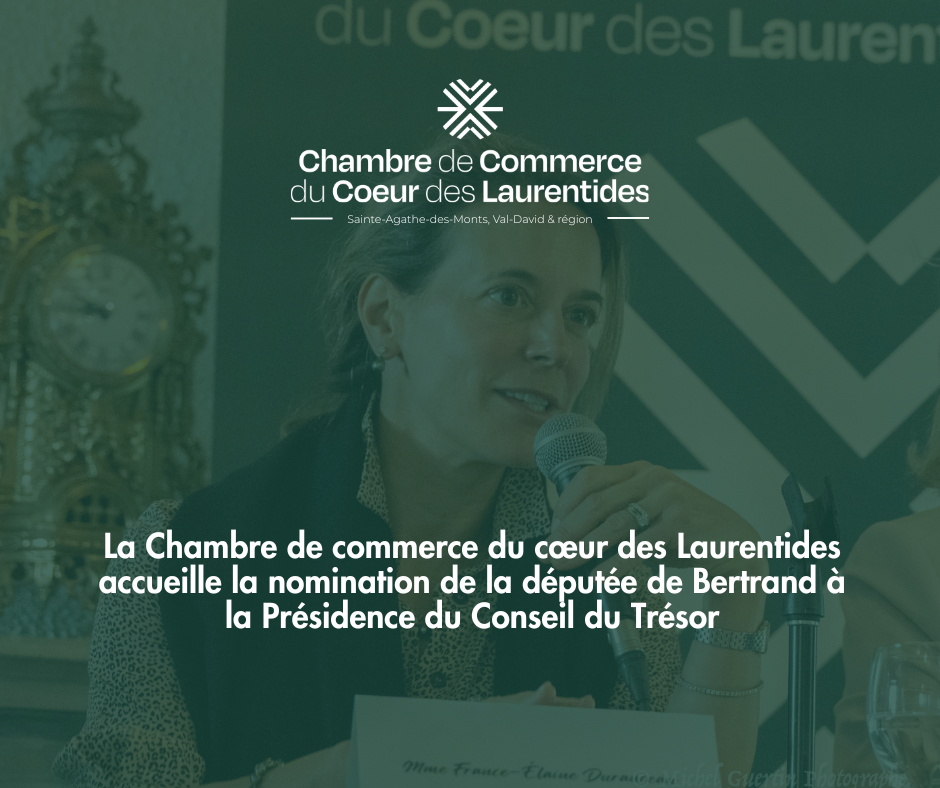 Sainte-Agathe-des-Monts, le 10 septembre 2025 – La Chambre de commerce du cœur des Laurentides accueille la nomination de Mme France-Élaine Duranceau, députée de Bertrand, à titre de présidente du Conseil du Trésor du gouvernement du Québec.